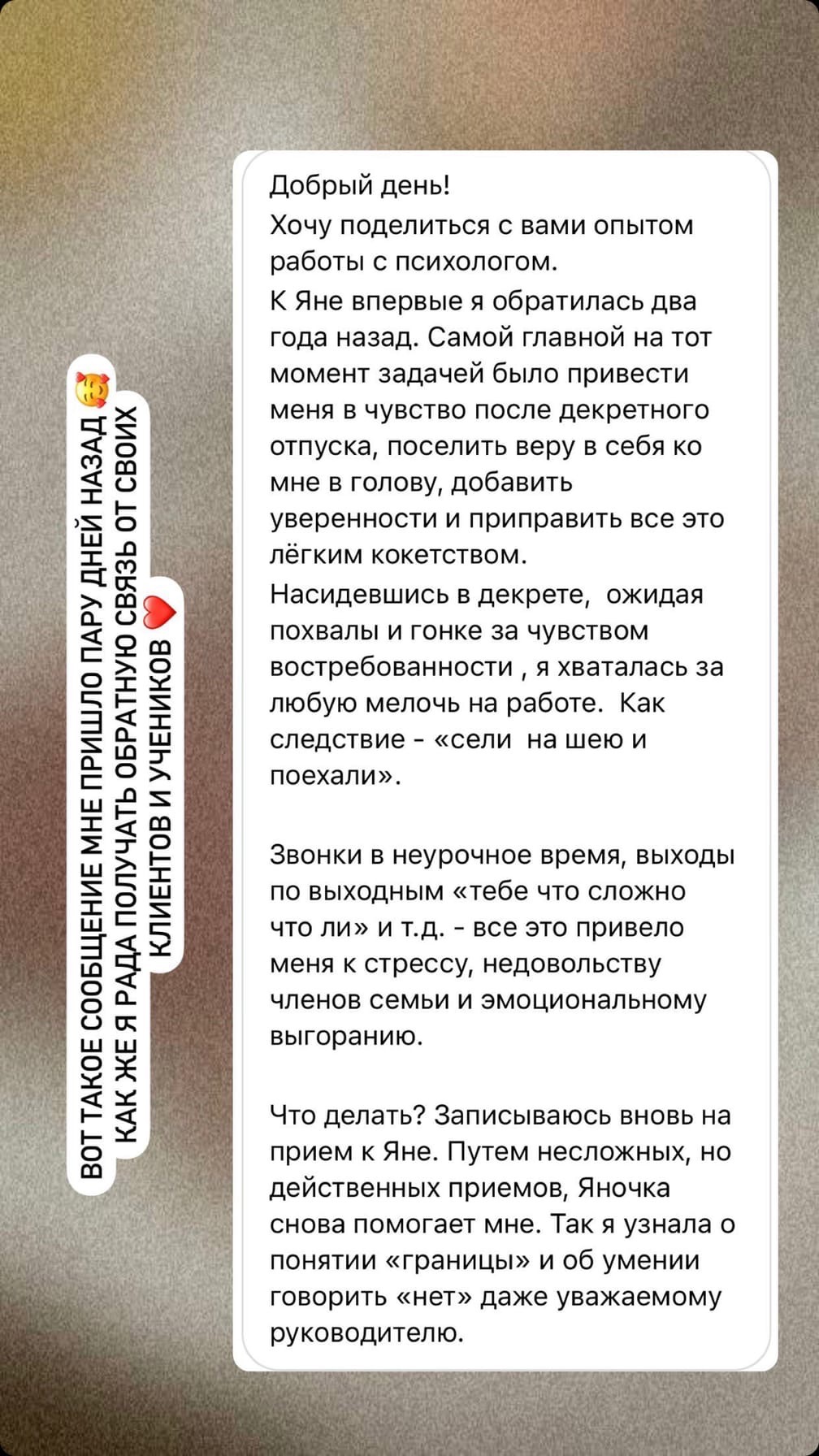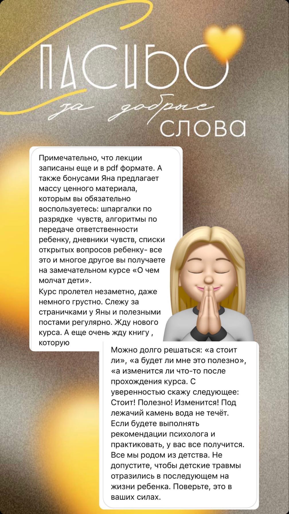 Обратная связь для любого эксперта всегда очень ценна! Она вдохновляет, мотивирует, окрыляет 🕊 В этом отзыве моя клиентка и ученица курса " О чем молчат дети" дети делится своим опытом 🤗