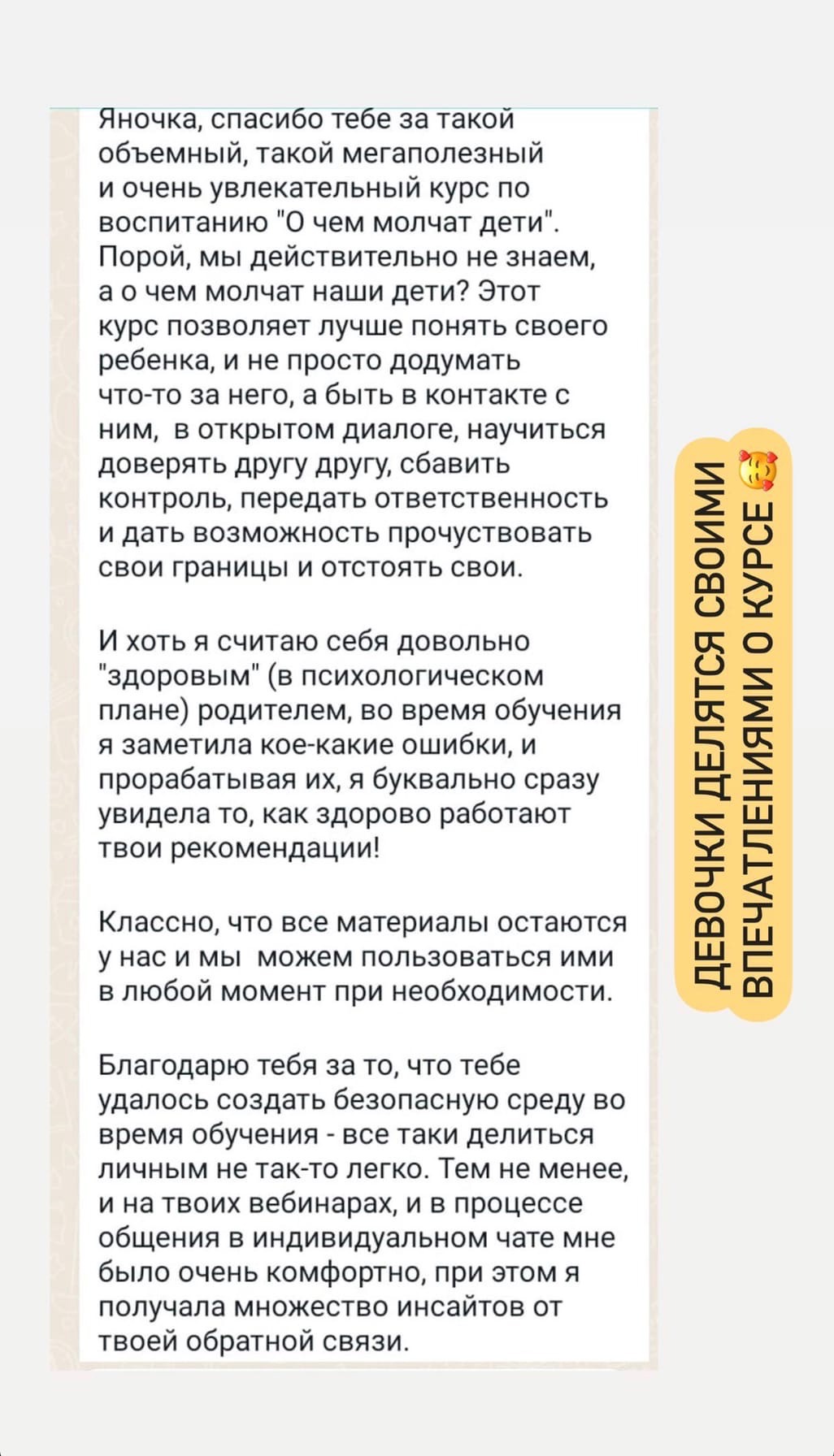 "Яночка, спасибо тебе за такой объемный, такой мегаполезный и очень увлекательный курс по воспитанию "О чем молчат дети". Порой, мы действительно не знаем, а о чем молчат наши дети? Этот курс позволяет лучше понять своего ребенка, и не просто додумать что-то за него, а быть в контакте с ним, в открытом диалоге, научиться доверять друг другу, сбавить контроль, передать ответственность и дать возможность прочувствовать свои границы и отстоять свои.