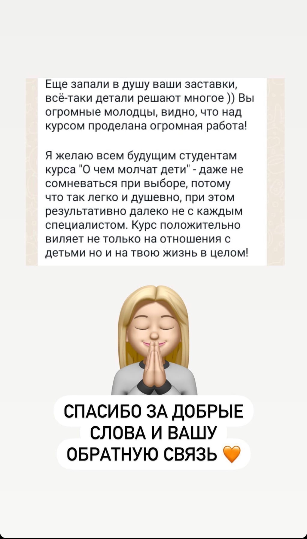 Я желаю всем будущим студентам курса "О чем молчат дети" – даже не сомневаться при выборе, потому что так легко и душевно, при этом результативно далеко не с каждым специалистом. Курс положительно виляет не только на отношения с детьми, но и на твою жизнь в целом!"