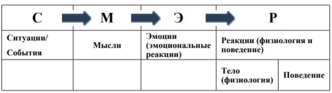 Р - реакция. Этот столбец можно разделить на 2: реакции тела (вспотел, задрожал, сжал кулаки, трудно дышать и т.д) и поведенческая реакция (что сделал: убежал, наорал, бросил трубку, куда-то не пошел и т.д.)